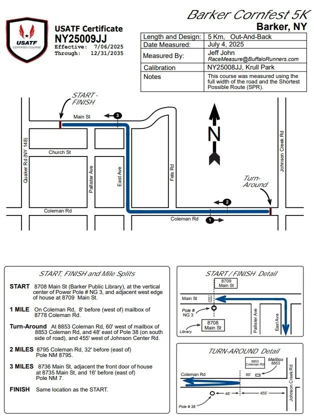 Online registration will remain open right up until the start of the race. All participants who register by July 17th at 9am are guaranteed to receive an official Cornfest t-shirt in their desired size. A small quantity of extra shirts will be ordered and distributed on a first-come, first-serve basis until they are gone. Packet pickup will take place at the Barker Public Library (start/finish line location) from 7:30am until the start of the race at 9am.
